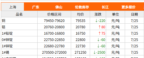 2025-7-25上海銅價長江1號銅價上海鋁價長江A00鋁價 長期銅價往期銅價查詢