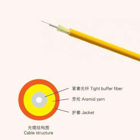 單芯光纜(GJFJV)使用單根Φ900μm或Φ600μm阻燃緊套光纖作為光傳輸介質,外覆一層芳綸作為受力加強單元,最外擠制一層聚氯乙烯(PVC)或低煙無鹵材料(LSZH,低煙、無鹵、阻燃)護套而成。