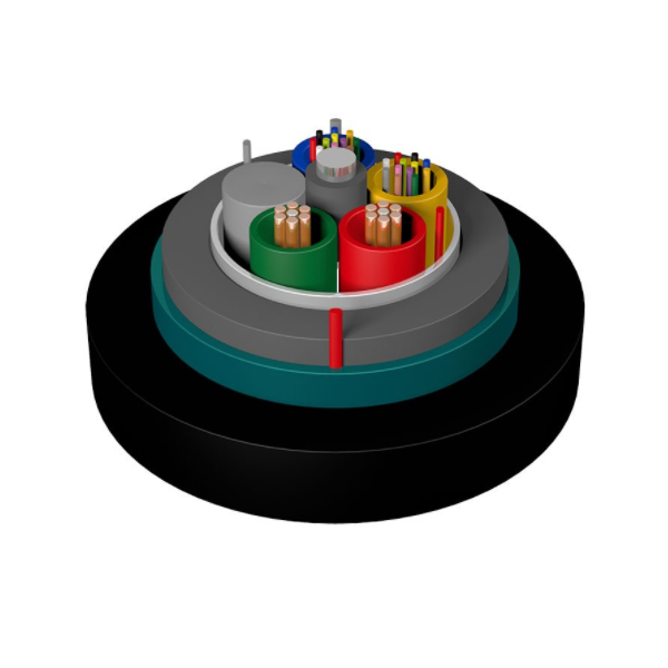 GDTA 型光電混合纜的結構是將單模或多模光纖裝入由高模量的聚酯材料做成的松套管中,套管內填充防水化合物。纜芯的中心是一根金屬加強芯,對于某些芯數的光纜來說, 金屬加強芯外還需擠上一層聚乙烯。松套管和所需規格的絕緣銅導線圍繞中心加強芯絞 合成緊湊的圓形纜芯,纜芯內的縫隙充以阻水填充物。涂塑鋁帶(APL)縱包后擠制聚 乙烯護套成纜。